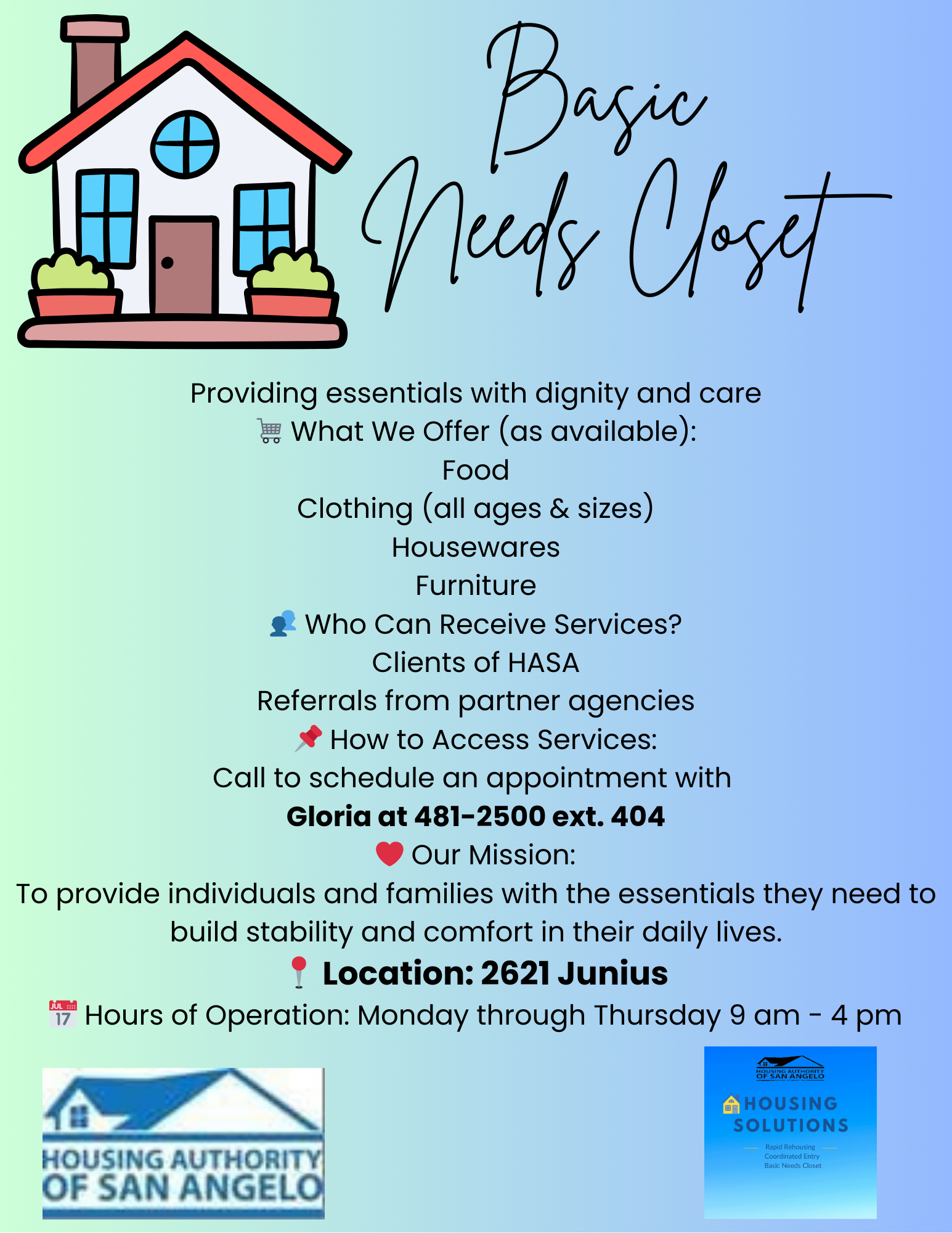 The HASA utilizes and maintains the Basic Needs Closet to provide non- perishable and perishable food items, clothing, shoes, household cleaning supplies and limited furniture for our applicants and participants. The HASA may impose limitations on specific items/amounts if necessary while supplies last.